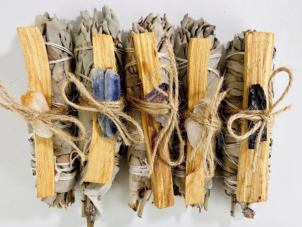 Sage/Palo Santo bundle w/stone – (sage) wisdom, good luck, prosperity, cleansing, redemption, home blessing, (palo santo) purification, creativity, connection to divine source, healing, removal of negativity.
